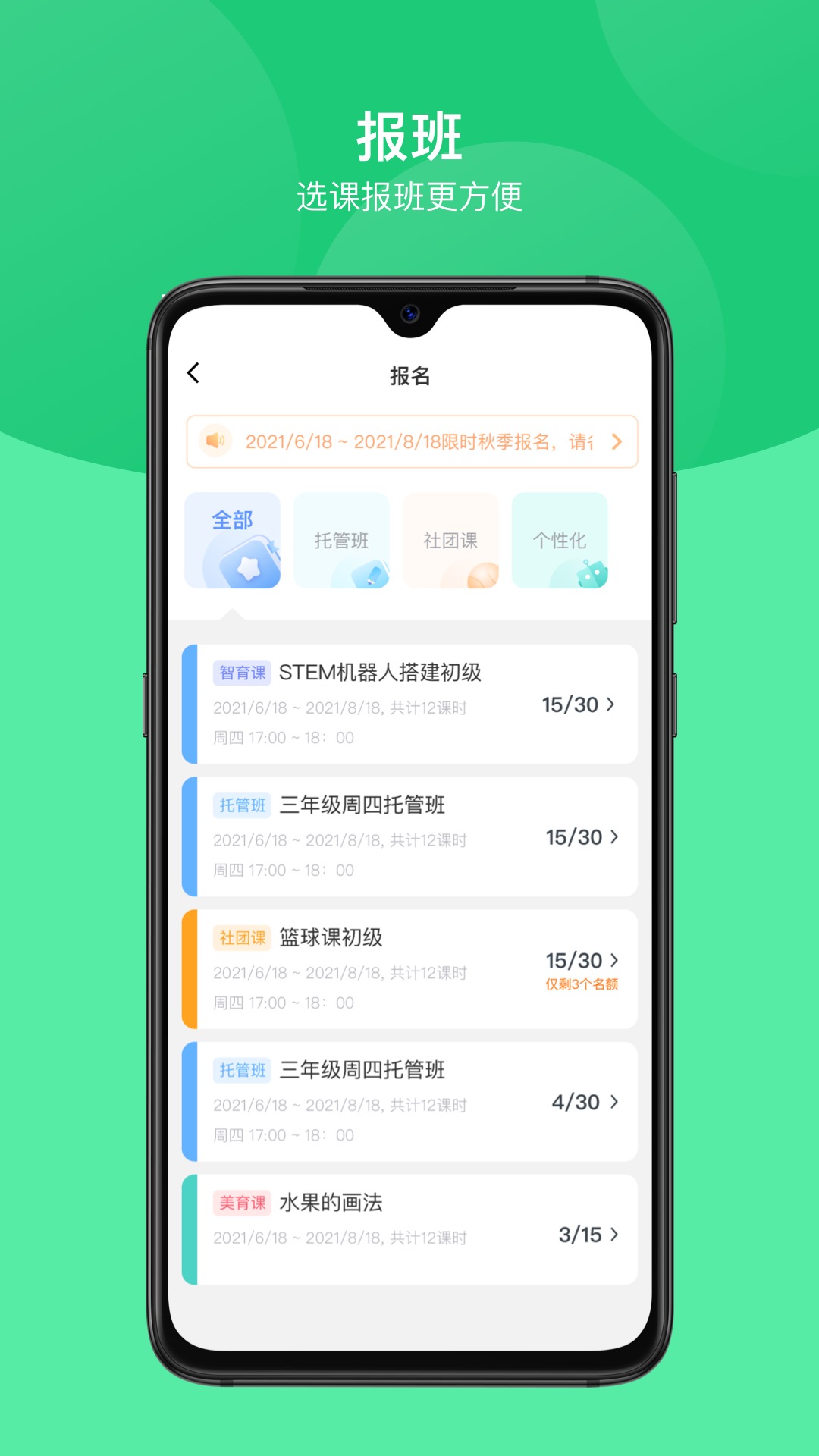 为学生和家长提供丰富的线下精品课程,在app中注册或购买,旨在充分利用孩子下午放学后的时间,促进学生综合素质的发展。