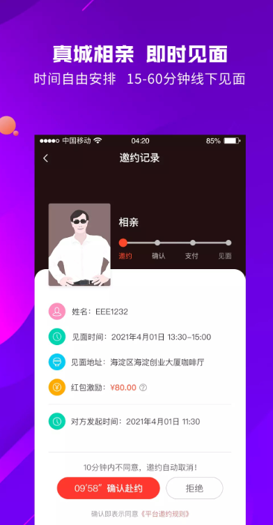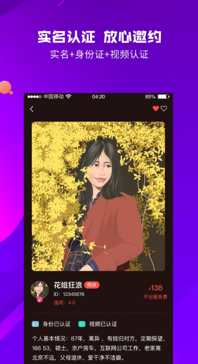 在同一个城市的相亲相亲平台上,实名信息认证的实名用户可以在线与朋友交往。可以自由参加各种模式和游戏方式。视频、声音、文字丰富的聊天方法可以根据彼此的心情来选择。没有限制。