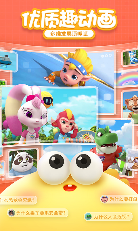 产品精选数百个与孩子生活密切相关,且符合其认知规律的科普选题。每个选题设置4大环节,以趣味视频的形式引发孩子主动思考、理解相关科普知识,再通过趣味互动让孩子在丰富的交互操作中了解百科知识,在答题中验收成果,培养善于观察与思考的小小科学家。