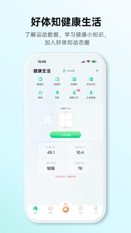 可自由设定减重/减脂目标,自动给出运动及热量摄入方案检测体内各种成分,并提供数据分析,同时监测一段时间内的身体各种成分变化,同时监测运动状况,督促运动改善体质