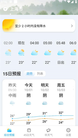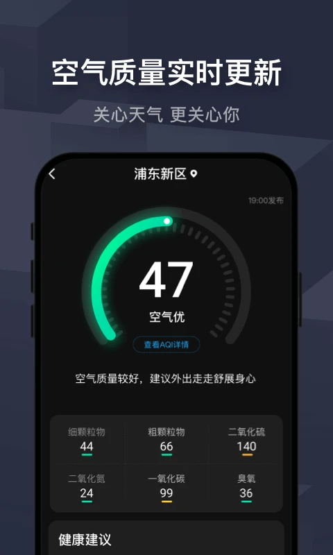 3、深入浏览,逐小时预报助您规划每日行程,15天预报为您长远打算,空气质量指数让您健康出行。