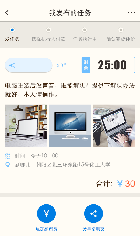 以“任务”的形式发布求助事项,可通过语音、文字、图片等多种形式进行描述,一键发布轻松便捷,召唤“超人”为您服务