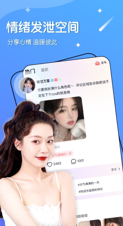 所有高尚的情感都羞于表达,所有深刻的经历都难以用语言表达。通过兴趣、约会、在线互动、视频直播、爱好趋势结交朋友。快速喵喵系统可以智能匹配您的本地朋友;随时随地与异性聊天。通过双方的线上互动和线下会面,提升交友兴趣。
