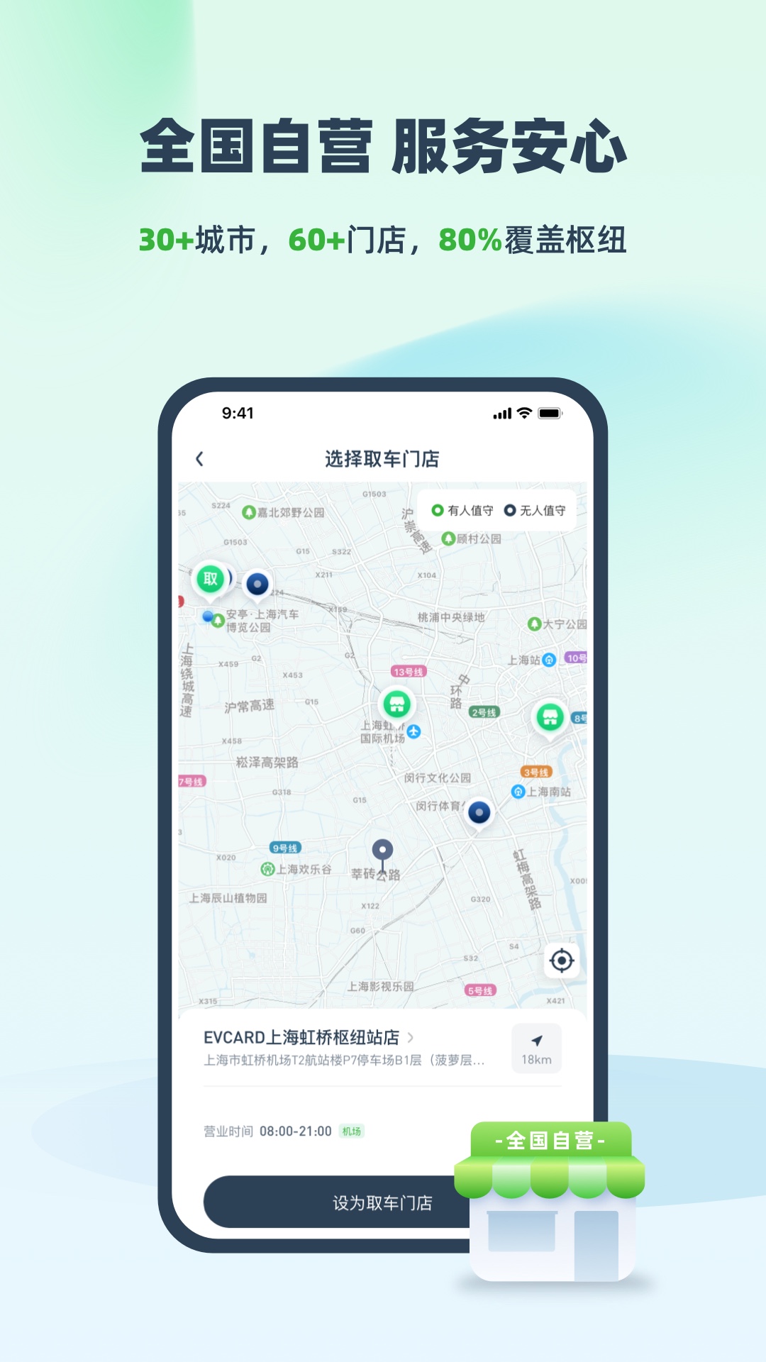 evcard已在全国近40个城市提供出行服务,设立租还网点超过1.3万个, 同时我们积极倡导高铁、飞机+evcard的“轻自驾”出行方式。截止目前,已在全国110个交通枢纽和1100多个酒店设立了租还网点。用户在所有evcard网点,租还车辆都无需额外支付停车费。