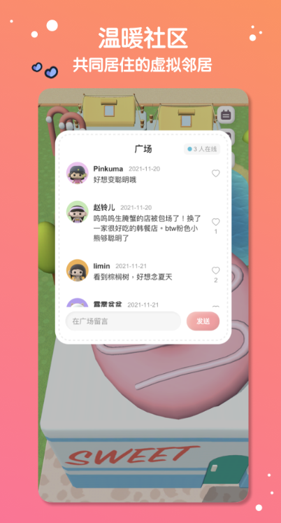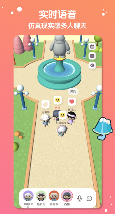 【实时语音】近距离语音功能,仿真现实见面感,与其他居民走近就能开启流畅聊天,并支持多人参与,小岛上的咖啡厅还设置了公共麦克风,方便居民进行话题分享和 Live Show。