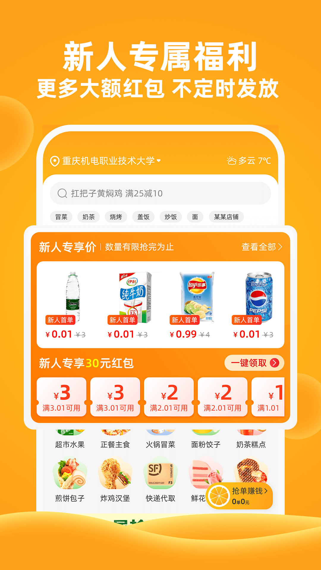 1、橙子校园提供校园生活服务,包括但不限于在线超市,在线外卖,特色小吃,跑腿服务等待;