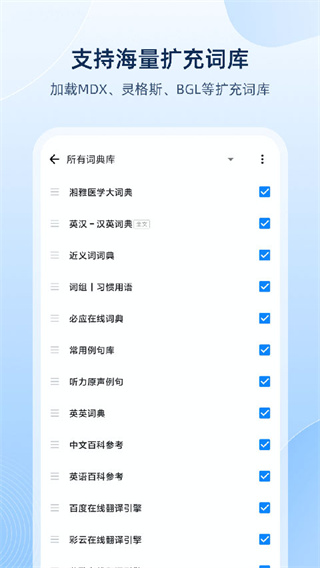 扩充词库:通过网络下载各语种的扩充词库,支持Mdict、灵格斯、Babylon等多种词典格式,覆盖医学、经济、工程、计算机等十余个领域。