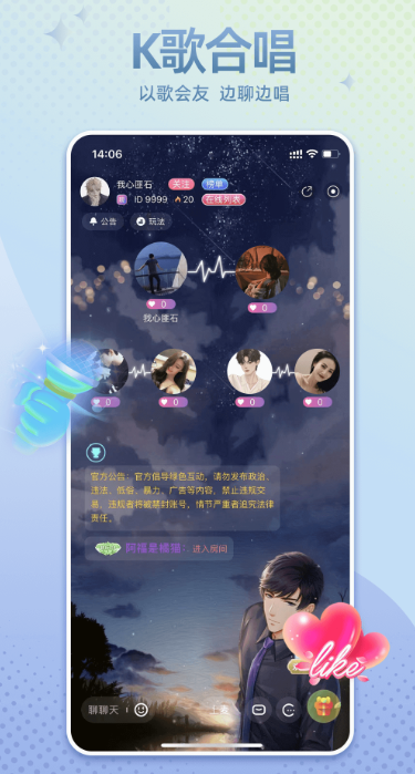 1、拥有更多多元化的房间,可以在这里自由的K歌,以歌声交友;