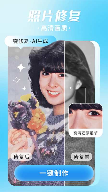 -应用人工智能技术技术性,能够 将模糊不清照片、低清照片、朦胧印痕修复,并对于脸部开展了超清还原修复。
