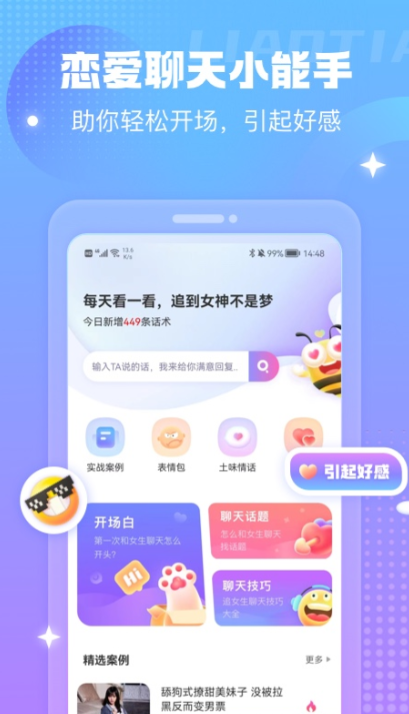 1、拥有超多的文案,海量的恋爱话术,用户都可以免费的使用与学习。