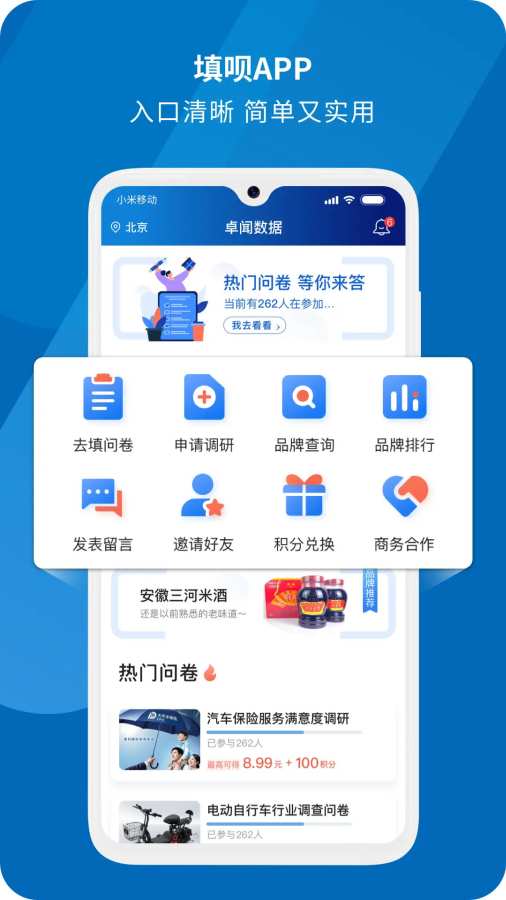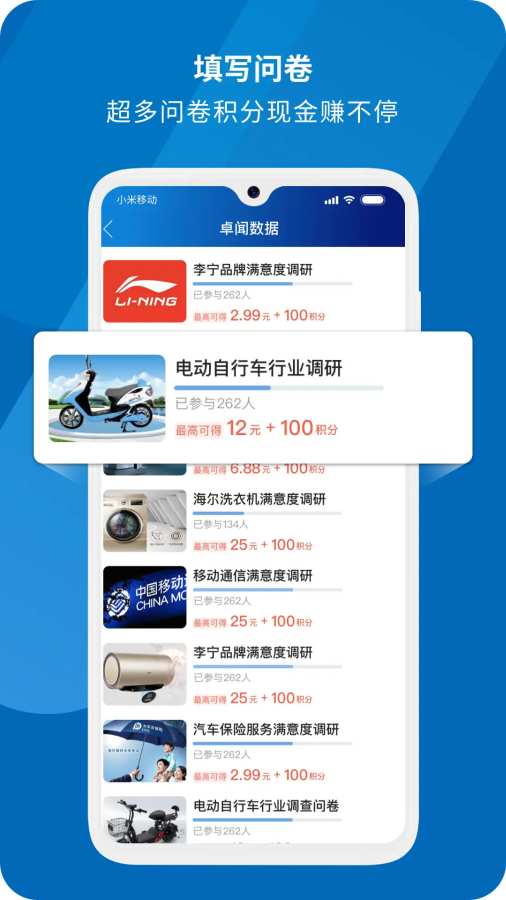 2、首页提供各类问卷调查服务,支持申请调研,品牌查询,积分兑换等等。