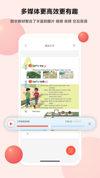 “语言乐学”平台为学生提供配套语文教材(3—6年级)、英语教材(3—9年级)的数字音像材料。数字音像材料根据各课内容进行碎片化处理,碎片化资源以列表形式呈现,包括音频、动画、视频、图片等,使学生的学习更便捷、更高效。