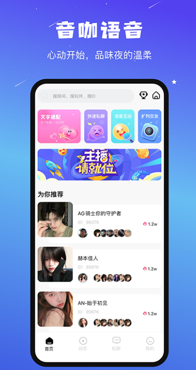 音咖语音交友app是可以让大家在线交友互动的平台,专门为年轻用户打造的哦,支持附近交友互动模式,开启自己的位置,寻找附近的单身用户,是大家社交必备的神器,带来了更多的优质服务,随时随地在线交友互动,不再是孤单的一个人,满足不同用户的社交需求!