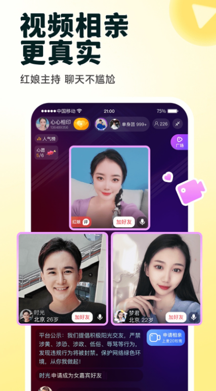 3、精准推荐交友用户,快速遇到Ta,实名手机注册,真人视频交友,一分钟的相见给你带来全新的体验。