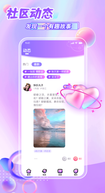2、每个人都可以发布自己的心情动态,也可以选择各种有趣的聊天和互动方式随时参与;
