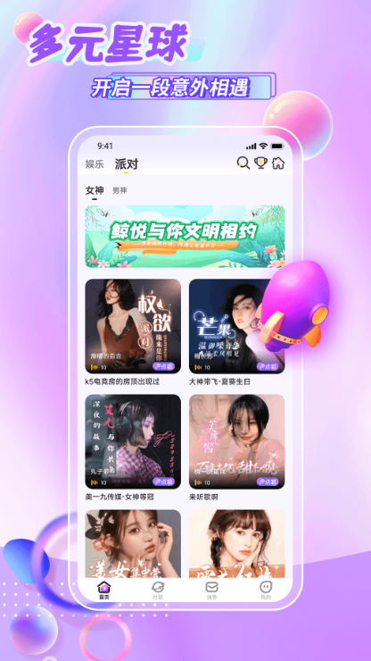鲸悦平台是一款社交交友类语音聊天软件,软件中丰富的功能以及超多好用的社交交友内容等你来获取哦,你可以在这里轻松的去扩大自己的社交圈子,而且还有各种漂亮的小姐姐和帅气的小哥哥等你来认识,有需要脱单的朋友千万不要错过了,更多聊天功能在这里等你来进行体验哦