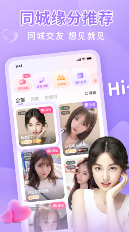 2、一键视频语音速配交友,快速匹配异性单身对象,深夜不再孤单,开始甜蜜同城邂逅之旅。