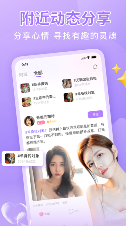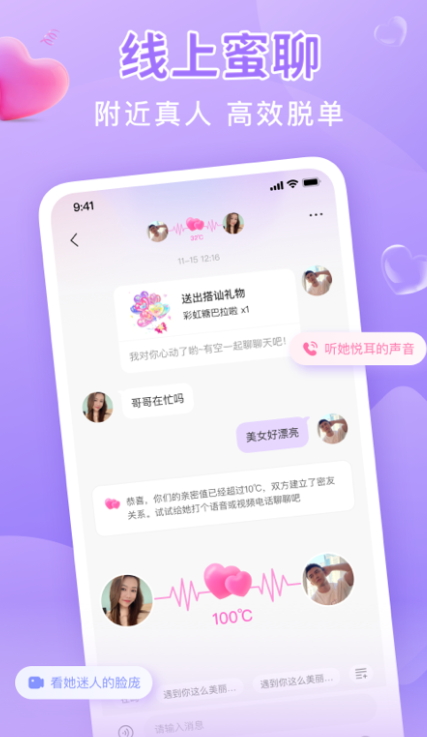 1、24小时在线甜言蜜语,语音聊天,分享动态,寻找附近单身异性;
