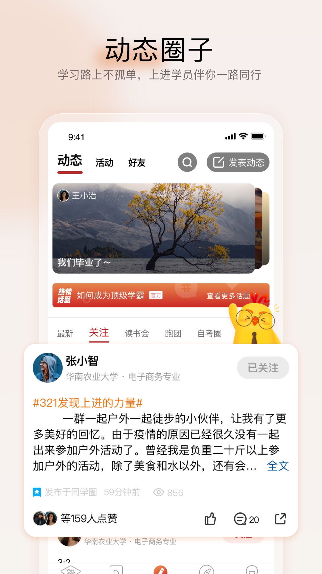 【上进青年聚集地】 在远智教育,你可以认识众多拼命努力提升自我的上进青年,交流彼此的上进故事和学习经 验,在上进路上相互扶持。更有上进读书会、上进跑团、上进训练营等丰富多彩的线上线下 活动来拉近彼此距离。不但实现学历的提升,更重要的是实现上进蜕变。