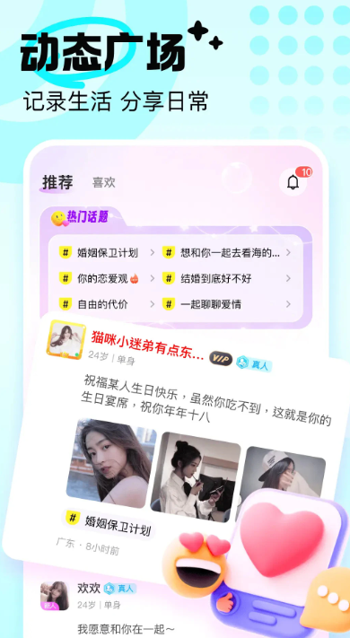 发布个人动态,分享精彩生活,快速匹配合适对象,推荐更多感兴趣的好友,随时随地在线沟通,放心交友,帮助单身用户快速脱单,找到更多知心小伙伴,交友更轻松。