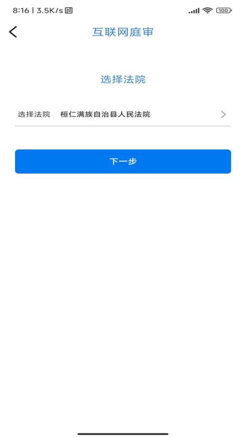 2、进入应用页面,可选择对应的法院,点击下一步。