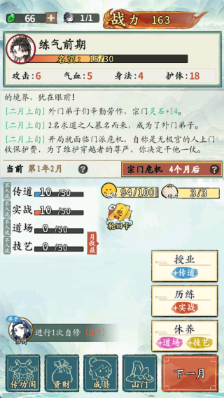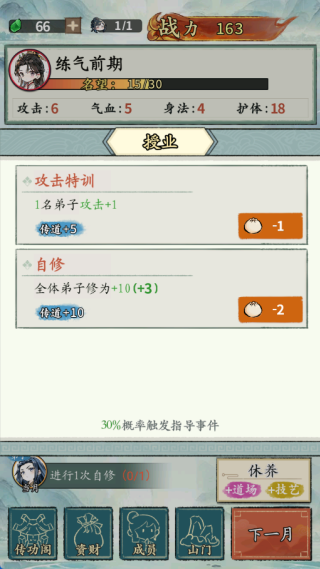 2、在每个月中,你需要利用能使用的精力来进行安排训练,提升实力应对仙侠事件。