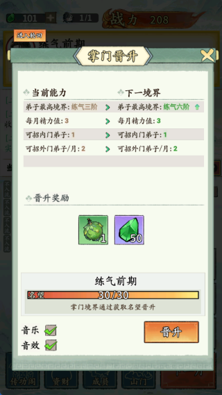 4、当灵气积攒满了之后,就能对实力进行晋升,掌门的实力决定弟子的最高境界。