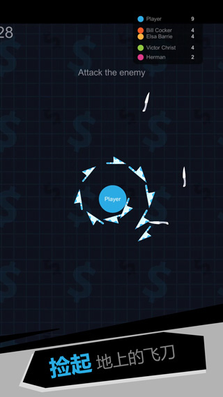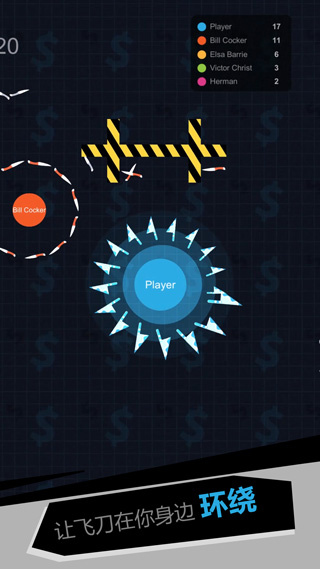 一款创新玩法的.io类游戏,通过对一大堆飞刀的熟练操控来进行混战,独创的龟缩防御机制(俗称王八状态)让你能轻松秀死对手。刀剑两开花!