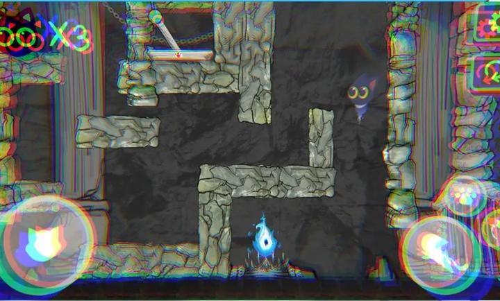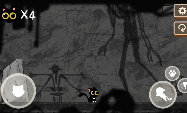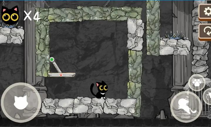4、进入关卡后控制小猫前往拉杆处,点击右边的按钮,即可控制石柱或者是机关转动