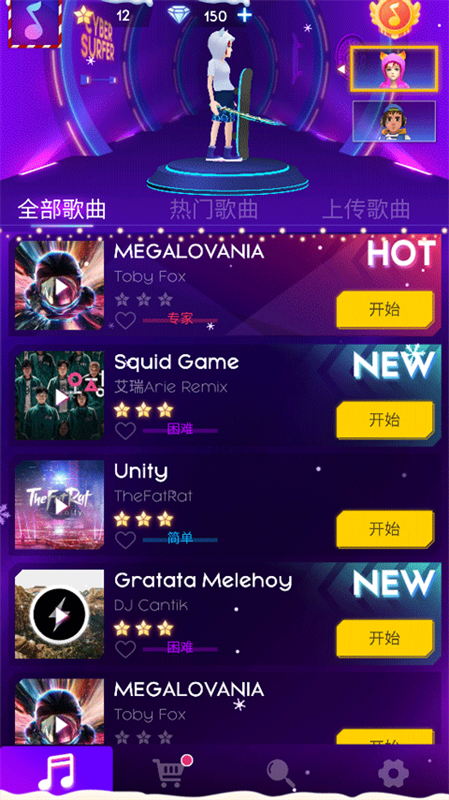 5、然后返回首页,我们可以看到有全部歌曲、热门歌曲和上传歌曲,玩家可以任意选择自己想要的歌曲,点击开始即可游玩;