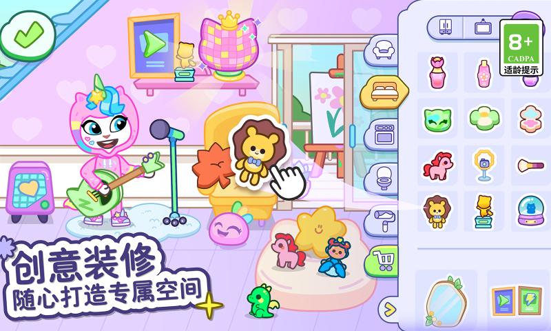 汤姆猫小镇是一款模拟经营类游戏,玩家可以在游戏中与汤姆猫家族的小成员们互动,体验经营小镇的乐趣,游戏汇集了汤姆猫、汉克狗、安吉拉、狗狗本、金杰猫以及贝卡兔等六位会说话的汤姆猫家族成员,每个角色都有独特的性格特点和服装风格,玩家可以与它们进行互动,感受快乐,玩家可以亲手布置宠物小屋,从墙纸到家具,全由玩家决定,打造个性化的居住空间,小镇中有多个场所供玩家选择,每个场所都有不同的奖品和玩法,增加了游戏的多样性和趣味性,游戏为每个角色提供了属性养成线,对应着角色在不同娱乐、工作中的熟练度。当达到对应星级时,玩家即可获得道具奖励,为角色养成提供了明确的目标。