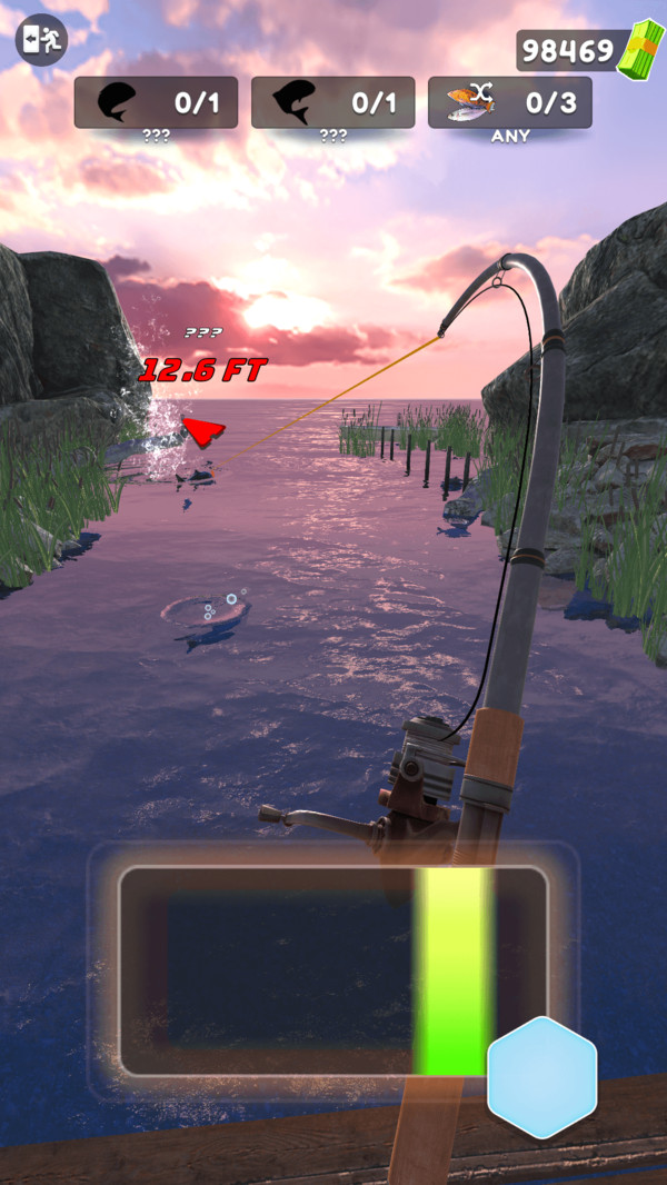 3、上钩的鱼会不停的挣脱,你需要保持方块尽可能的在绿色区域,完成每个关卡钓鱼任务获得奖励。