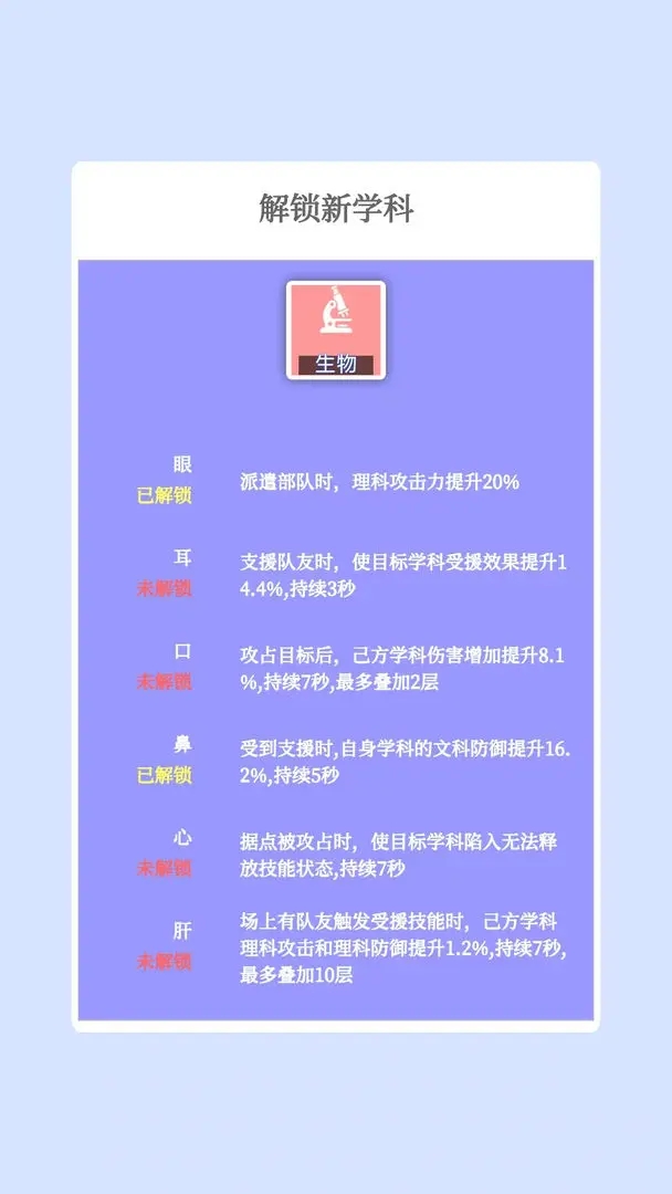 1、需要合理配置学科兵力:文科部队擅长持久战,理科军团爆发力强,艺术学科则拥有改变战场环境的特殊能力;
