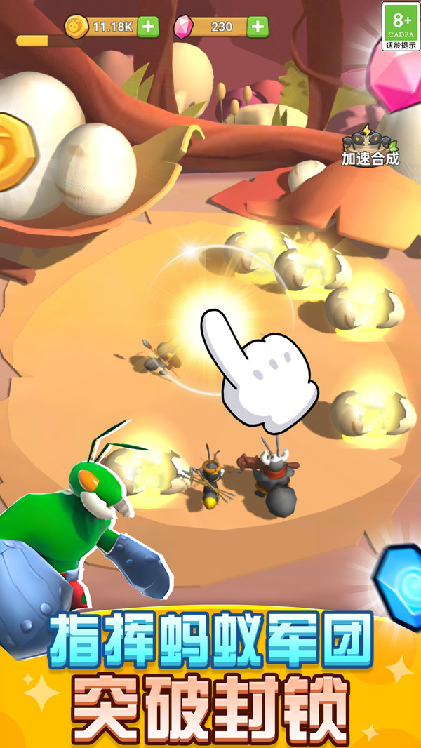 3、在巢穴中,你可以利用获得的金币来购买更多的蚂蚁士兵,在这里相同兵种会合成获得新兵种。