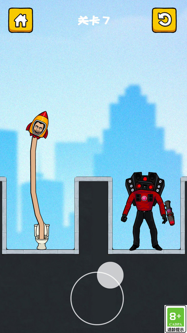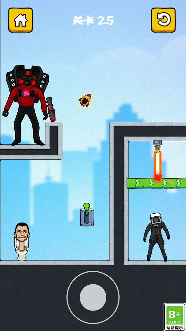 3、通过画线来引导马桶人的射击轨迹,这种玩法结合了策略与操作,要求玩家精准规划线路以击中监控人。