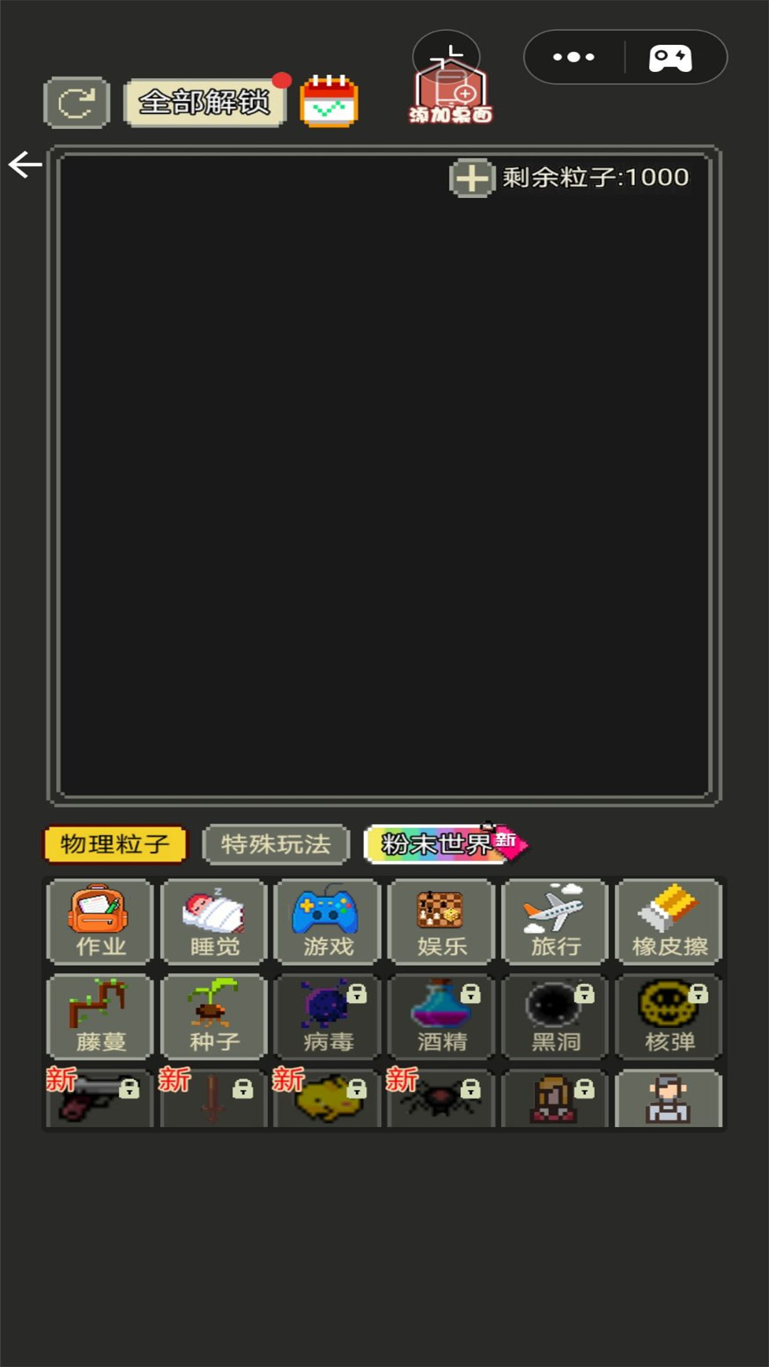 2、这里有各种各样的模式,你可以在这里选择,物理粒子,特殊玩法,以及迷你世界;