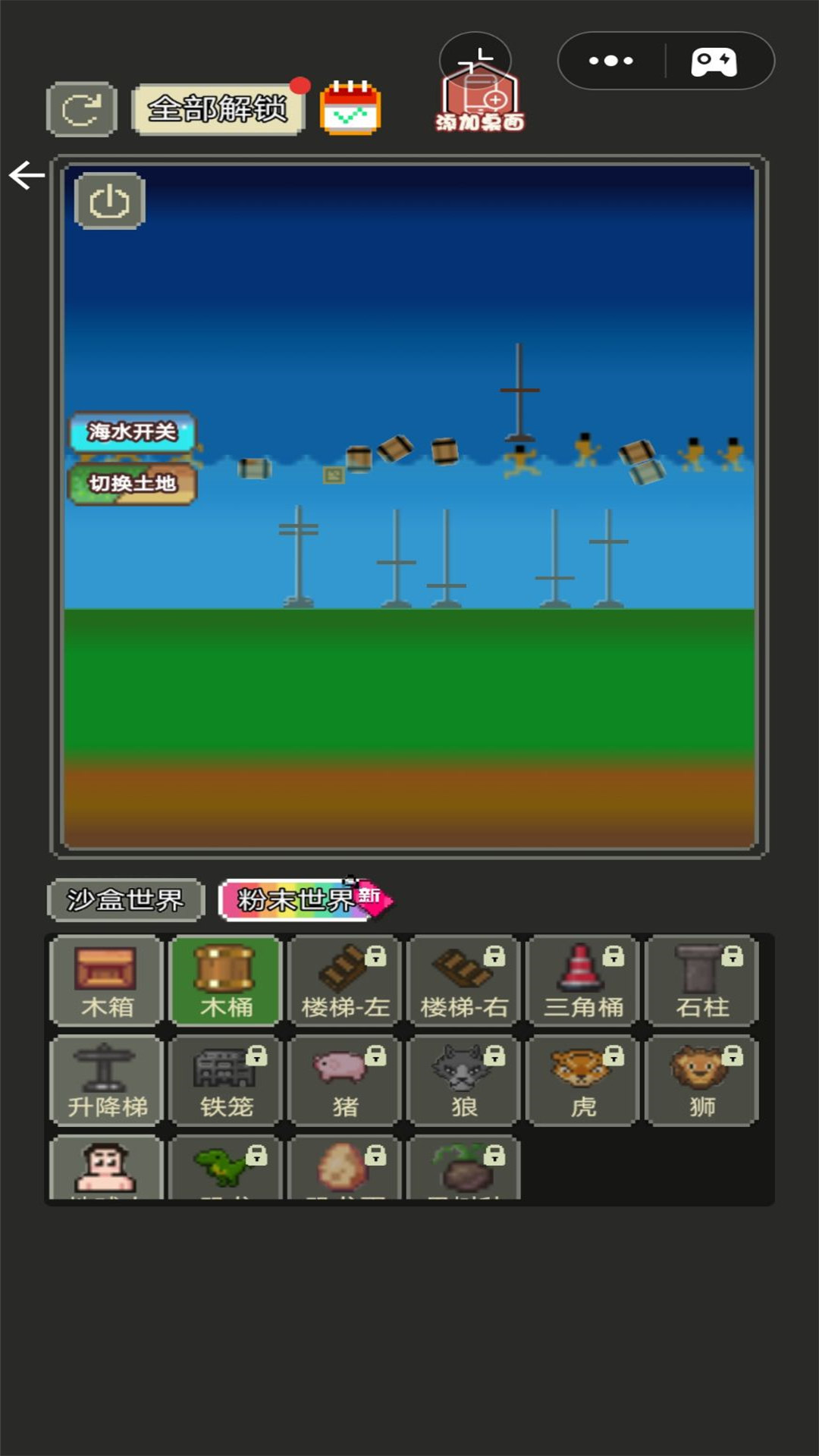 2、通过操控各类粉末与元素,在像素化画布上实现从简单场景搭建到复杂机械装置设计的全流程创作;