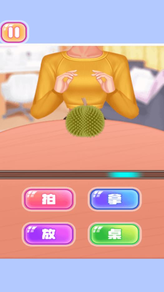 3、四个不同的按键,拍,拿,放,桌,需要在通过的时候按下对应文字。