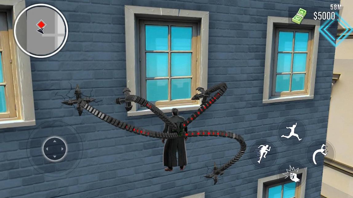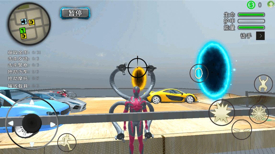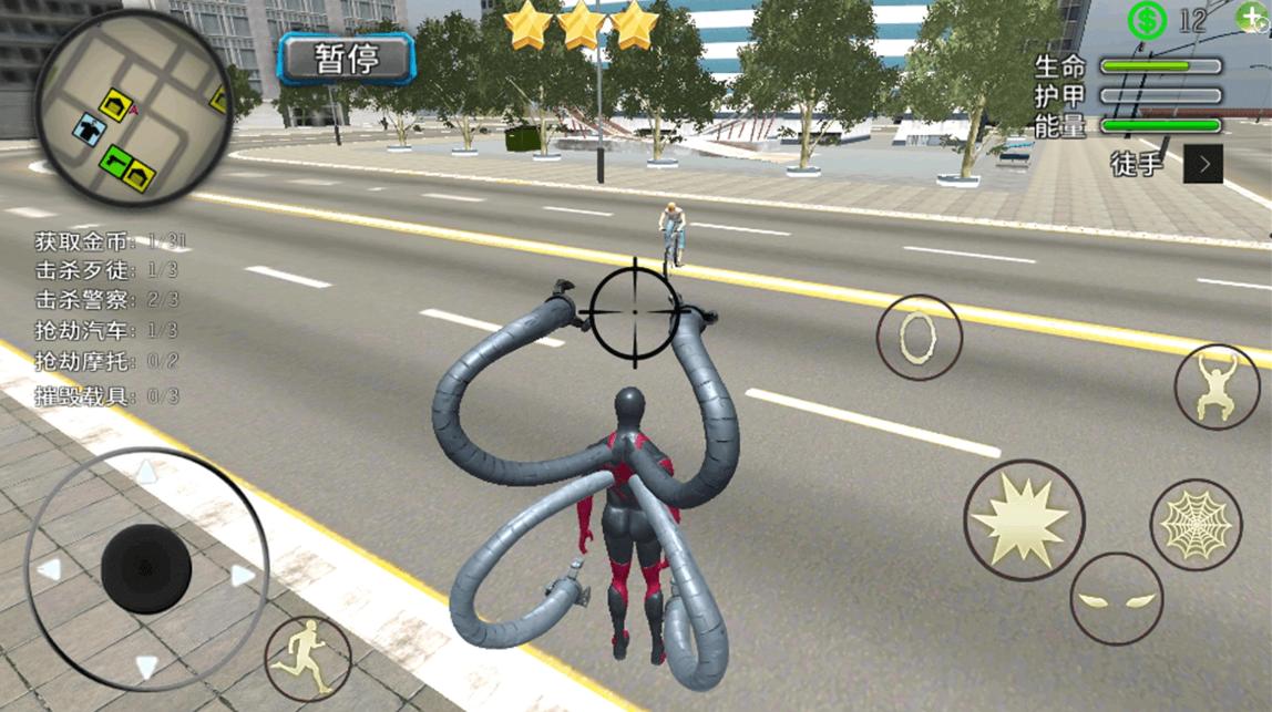 1、使用虚拟摇杆控制角色移动,点击发射蛛丝钩住建筑实现高空摆荡。