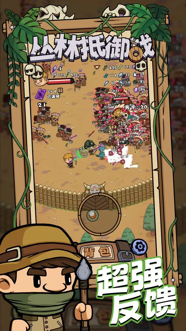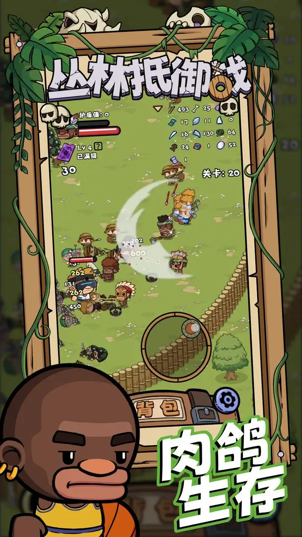 丛林抵御战是一款融合了肉鸽和省份村玩法的动作冒险游戏,在游戏中,玩家将选择新的武器和道具,合理的搭配不同的战斗阵营,随机的挑战新的地图开始冒险,装备不断的升级自由的对战,打造自己的专属装备,在这片危机四伏的原始丛林中,你不仅是猎人,更是猎物。你的目标只有一个:运用一切手段,在无尽的敌潮与恶劣环境中生存下来,揭开这片绿色地狱深藏的秘密。