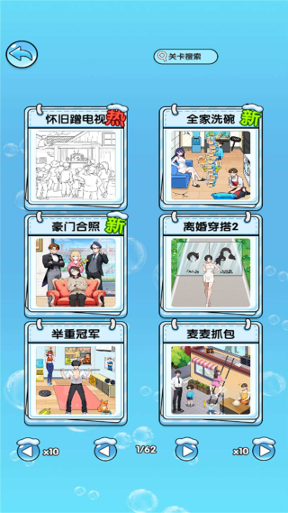 1、游戏中有怀旧蹭电视、全家洗碗、离婚穿搭2等多个关卡供你畅玩。