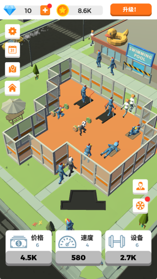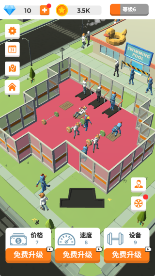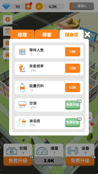 2、利用收益,玩家还能对健身房进行升级,提升等待人数来客评率等属性,