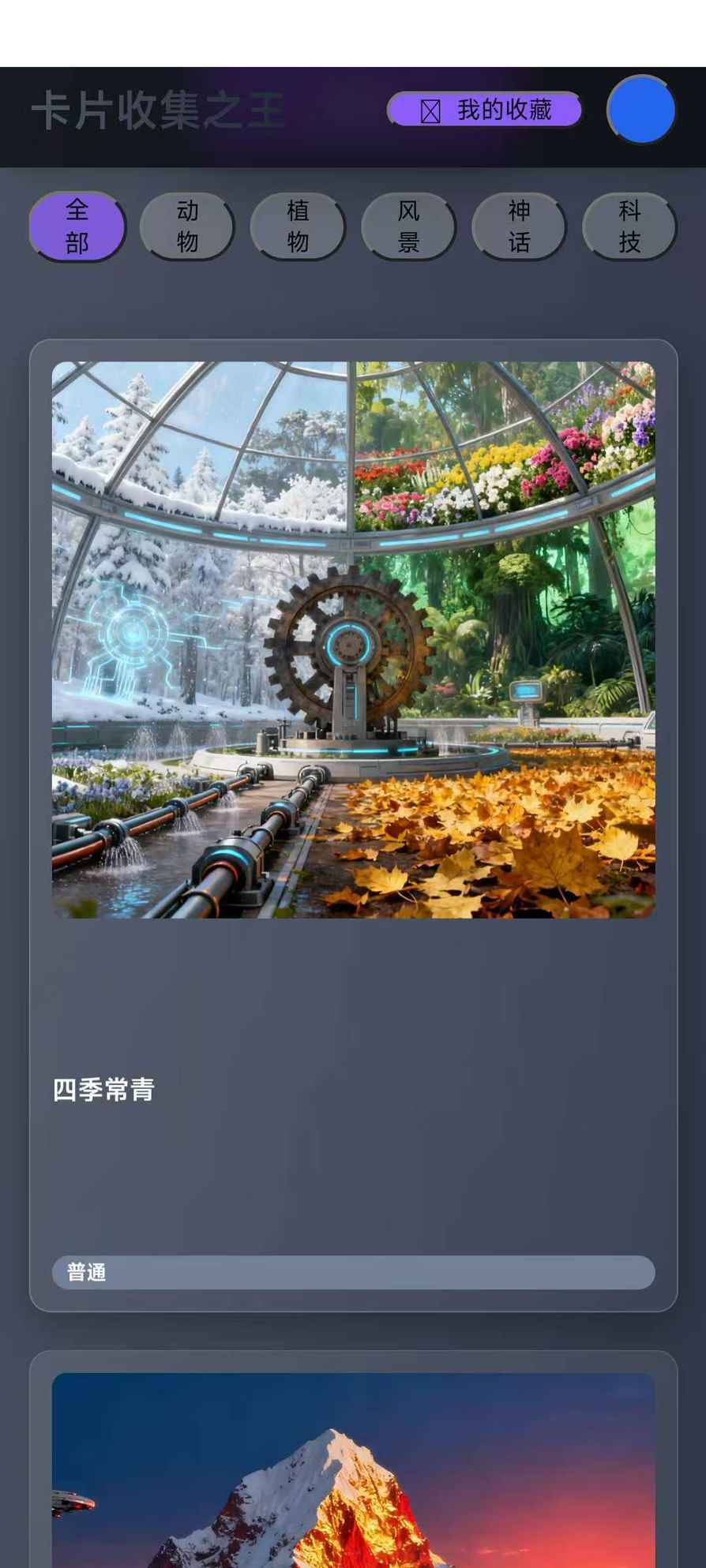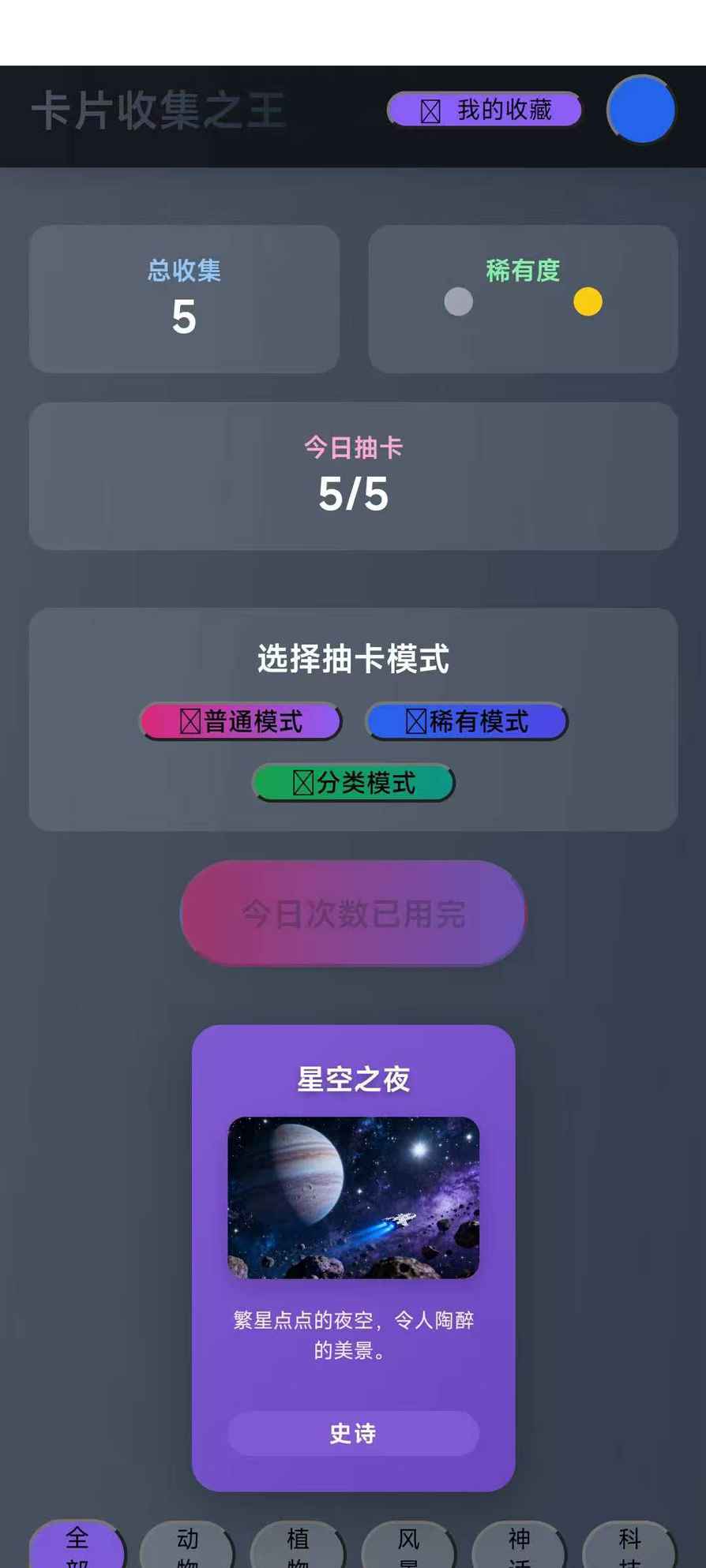 卡片收集之王是一款轻松休闲的模拟抽卡游戏,操作十分的简单,点击即可选择分类,点击抽卡即可收集喜欢的卡牌,操作十分的简单,满足不同玩家的需求,融合了抽卡的期待感、模拟经营的满足感与益智、闯关成就感的休闲治愈游戏。你的目标很简单:通过智慧与策略,收集世间所有精美的卡片,构建你独一无二的收藏馆,成为名副其实的卡片之王。