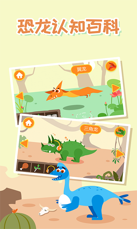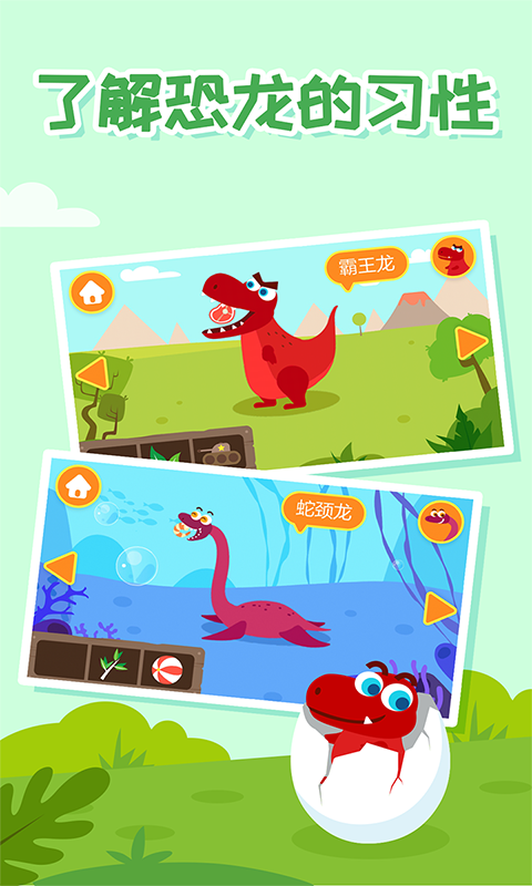3、新增多个恐龙场景,带小朋友认知更多恐龙生物,互动环节加深了宝宝对恐龙的认知了解;