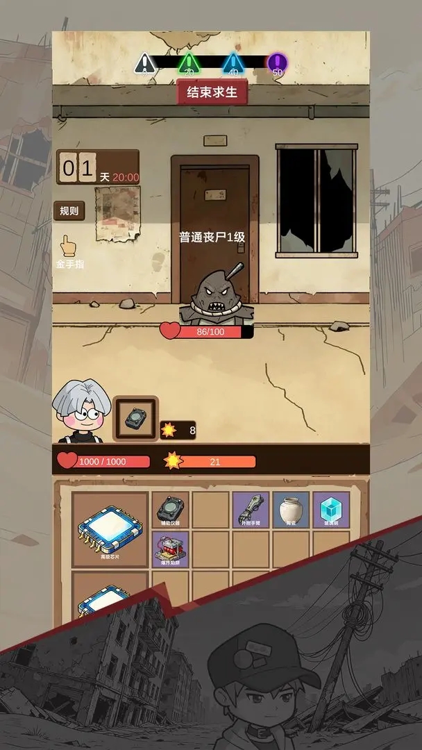 宿舍求生废土篇是一款末日风格的生存冒险游戏,置身于宿舍中开始求生,外出探索其他的宿舍获取丰富的生存资源,建立强大的防御系统,抵御入侵的怪物,利用背包有限的空间放置生存资源,完成生存挑战赛,在这里,你不再是象牙塔中的学子,而是必须利用眼前一切资源、挣扎求存的战士。你的宿舍是你最初的避难所,也是你踏上废土冒险的起点。