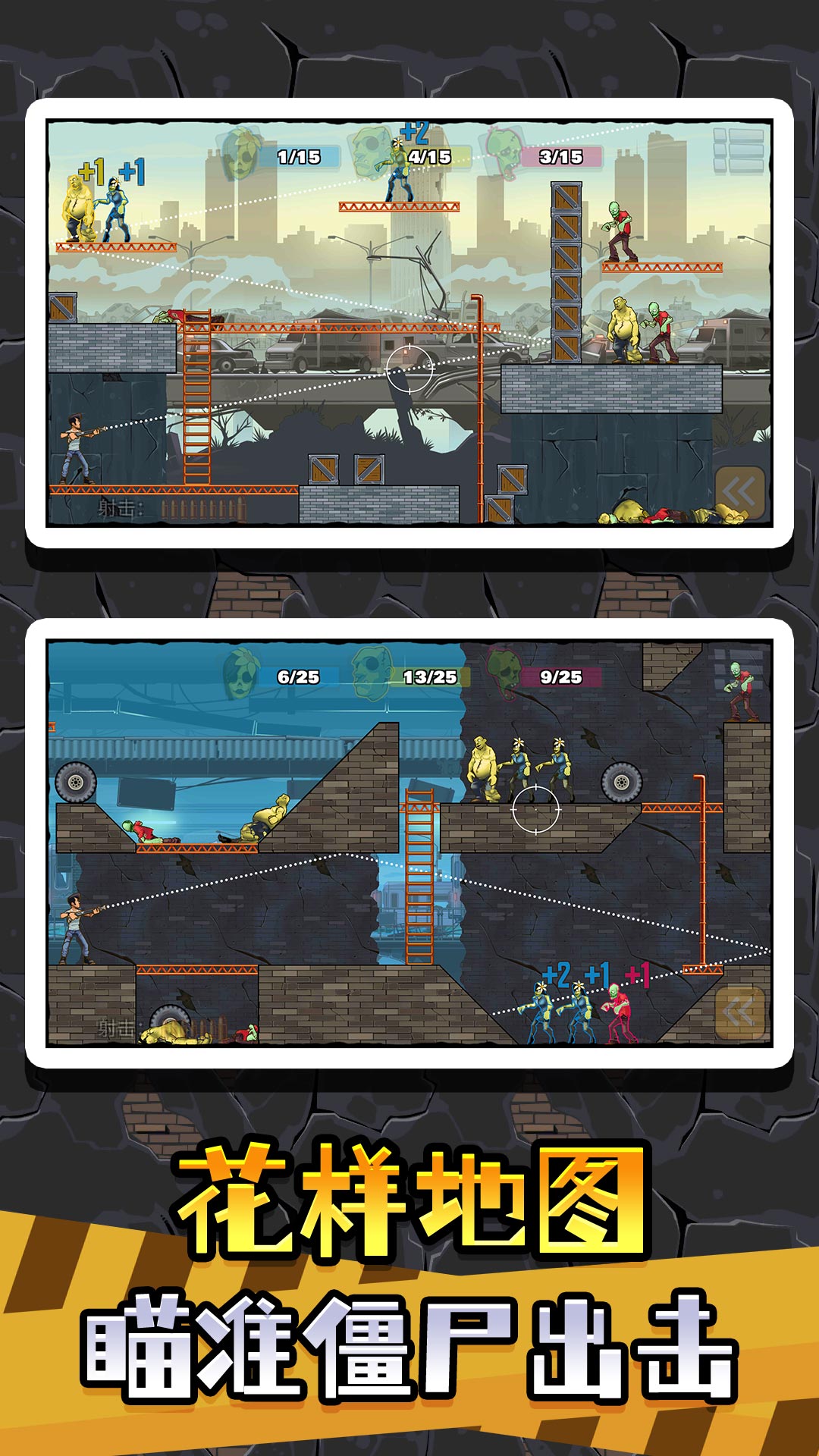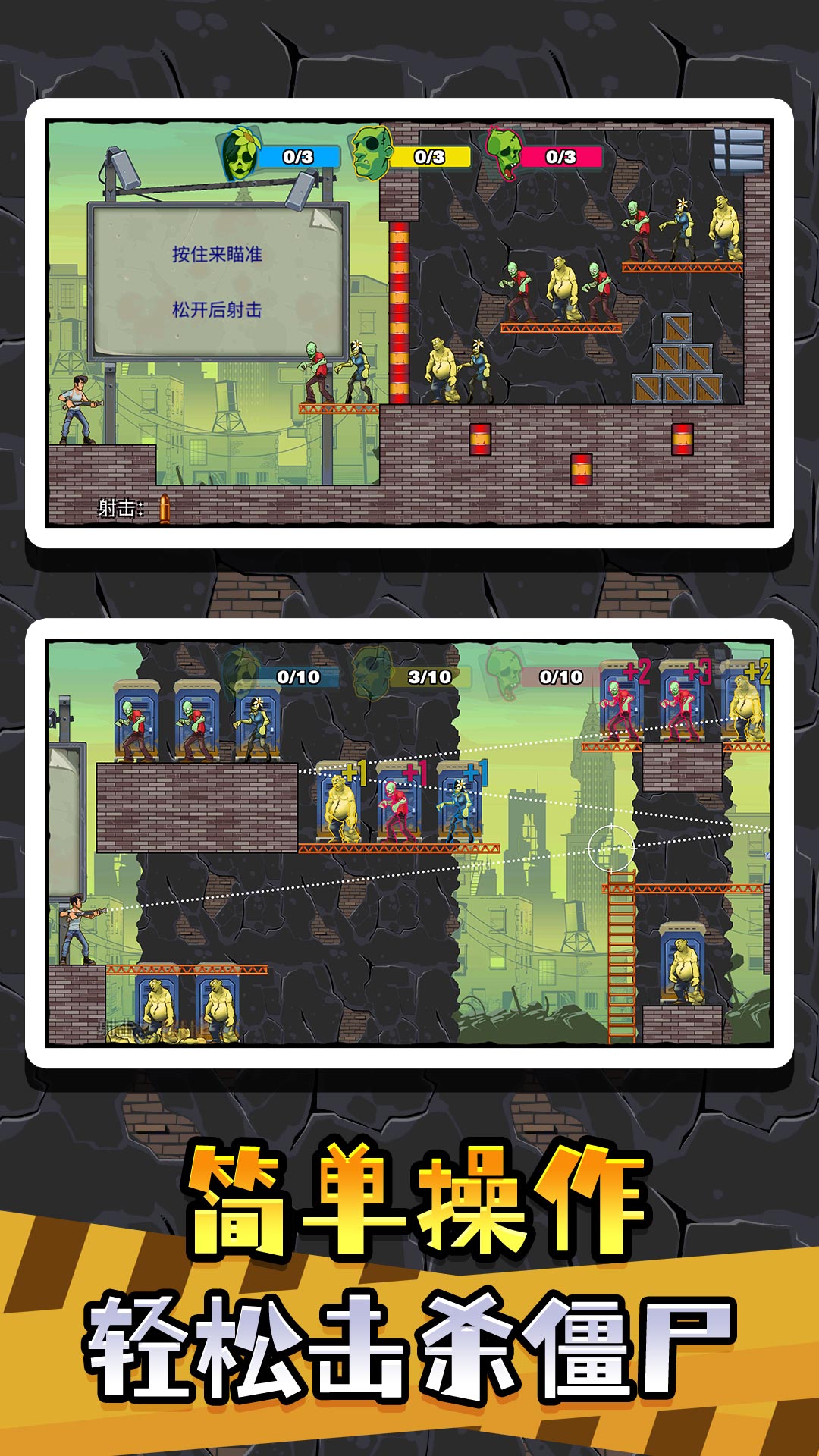 1、进入游戏,按住瞄准开始射击,一键即可射击大量的僵尸,完成本关的目标任务。