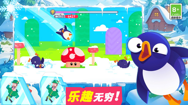 2、支持解锁和升级角色,企鹅角色可能拥有专属技能,如滑翔、冰冻攻击,载具则具备差异化属性;