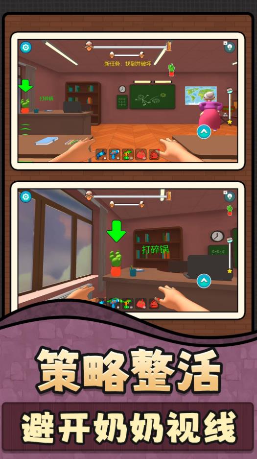 2、巧妙利用沙发、花坛、玩具箱作为掩体,观察奶奶的巡逻路线,在她转身瞬间,开始捣蛋。