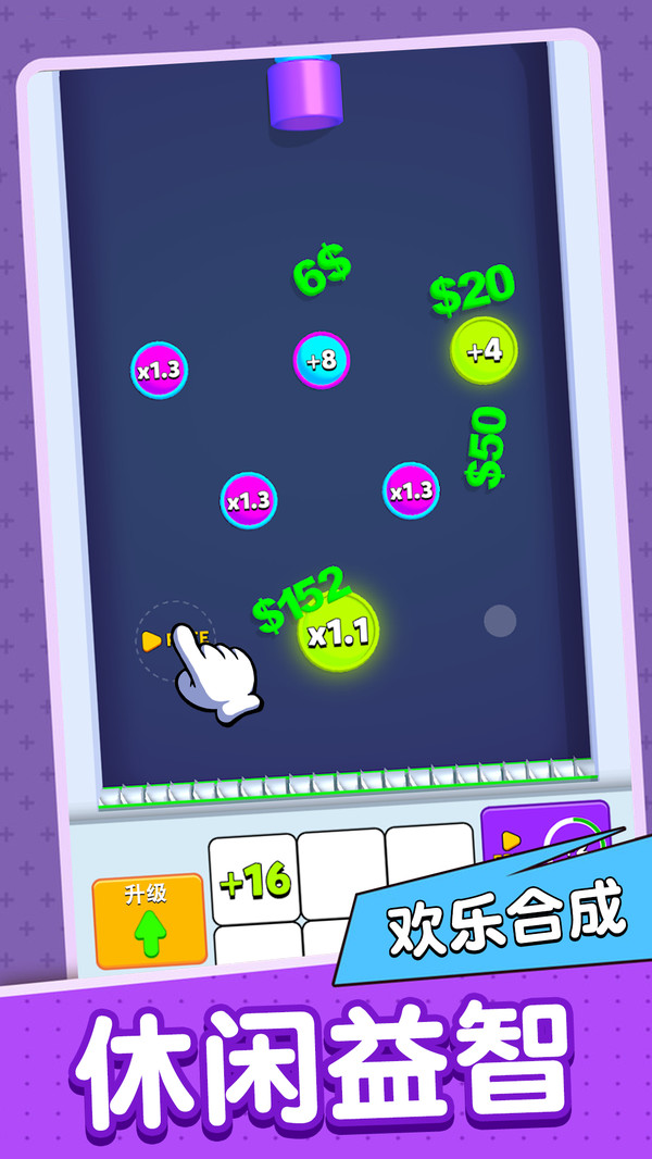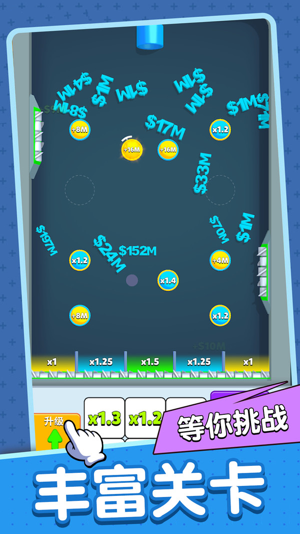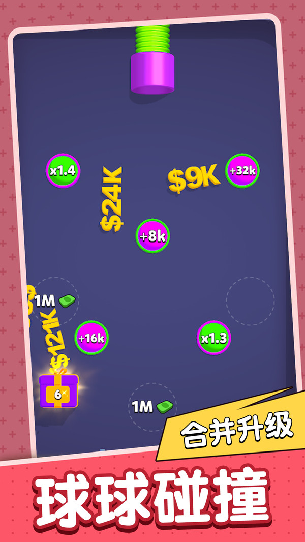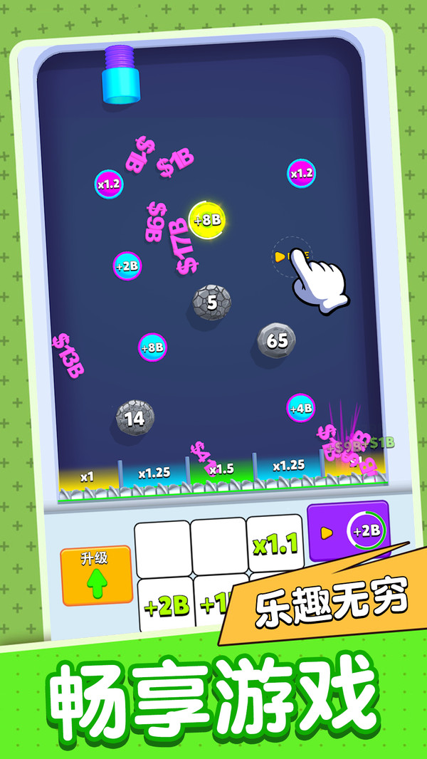 2、从管道掉落的数字撞击空位即可翻倍,让收益逐渐变大,解锁更多孔位。