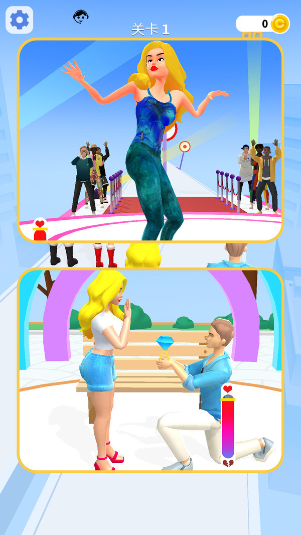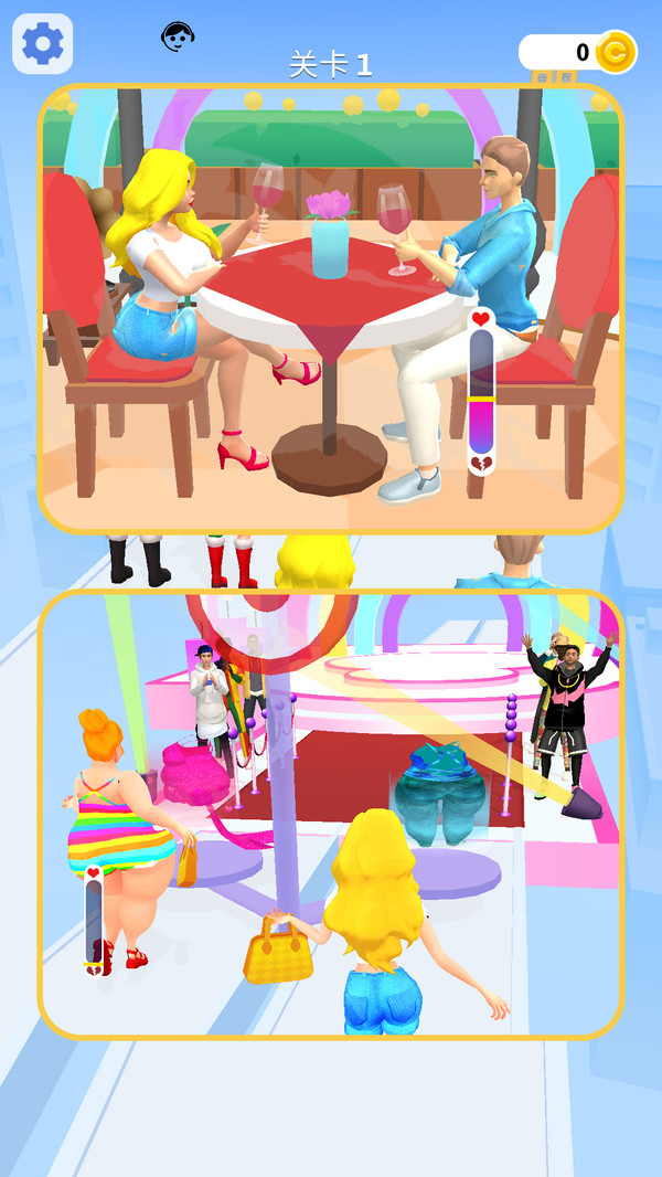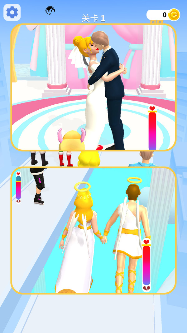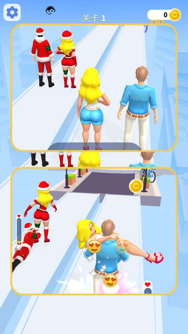 2、收集沿路金币,射击各种目标物,收集丰富的花束,成功的到达终点,感情升温。